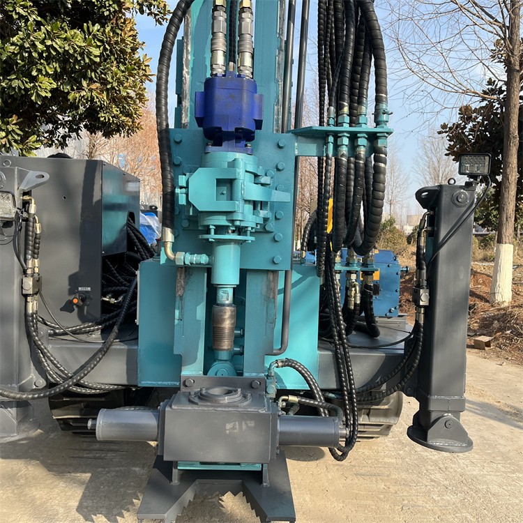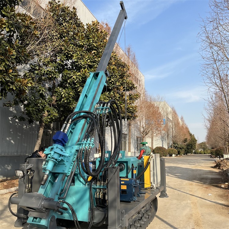 履帶式勘探取芯鉆機的介紹hr-98型鉆機是一種新型履帶式多功能全液壓鉆機,改鉆機由柴油發動機連接液壓油泵,為液壓沖擊動力頭和液壓回轉動力頭提供動力,利用該鉆機內的液壓沖擊式動力頭,高頻撞擊巖心管頂部鉆